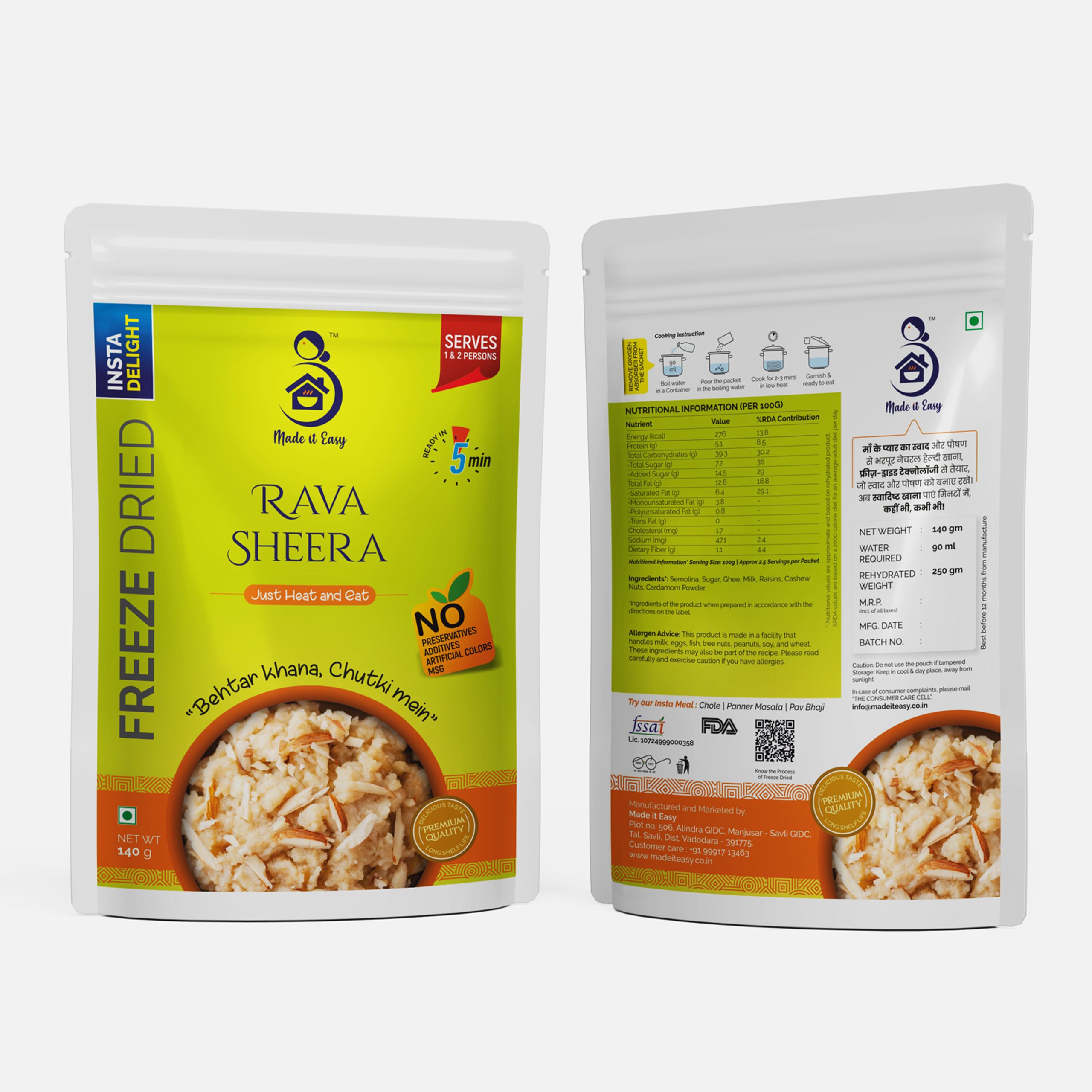 Discover the freedom to enjoy Rava Sheera anytime you crave them, all thanks to Made It Easy. Our innovative Ready-to-Eat freeze-dried Rava Sheera captures desi Indian flavor in every bite, eliminating the need for hours of chopping, grinding, or simmering. Fresh ingredients and rich spices are meticulously sealed to ensure every meal bursts with taste and nutrients.
